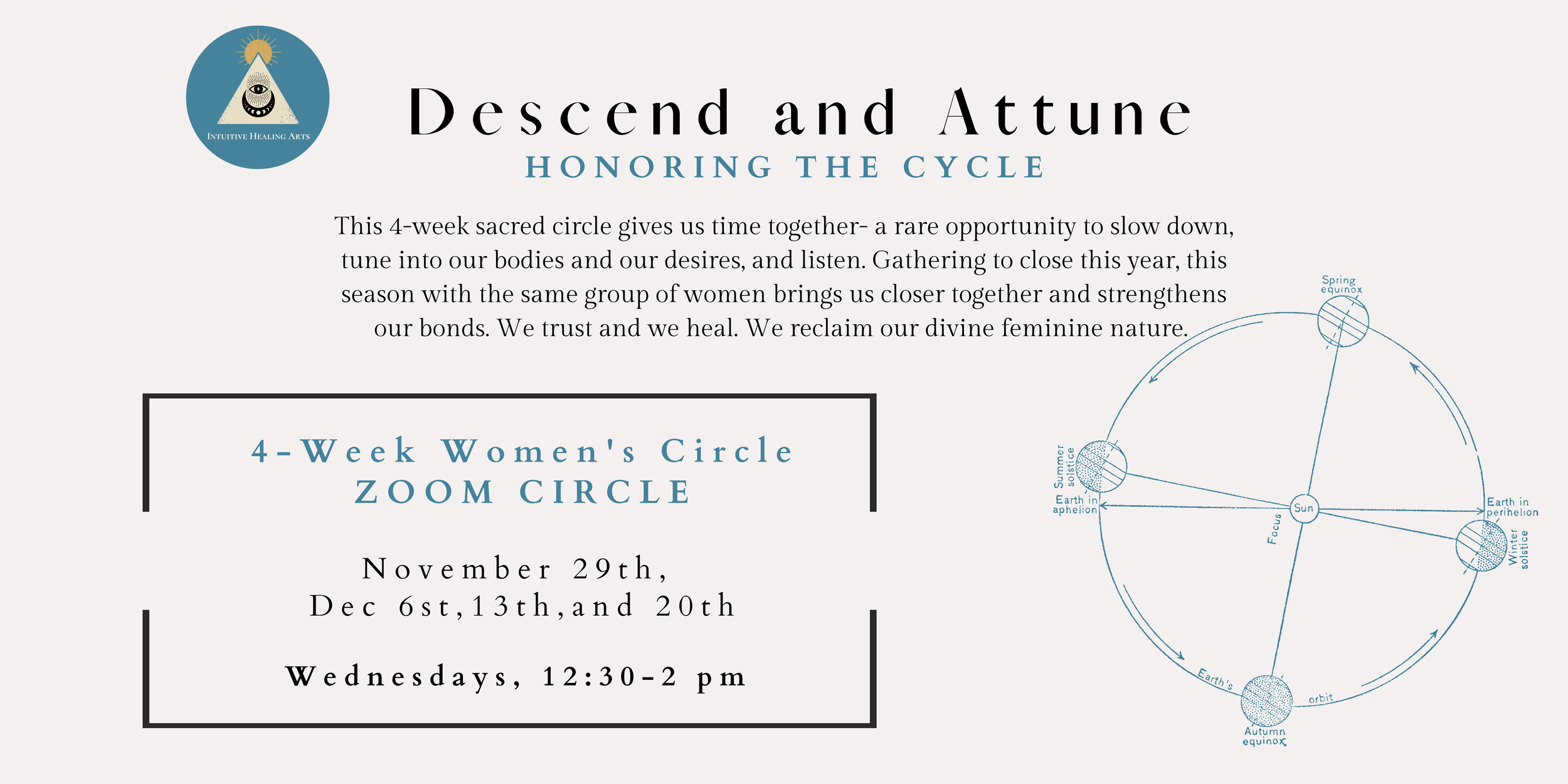 This 4-week sacred circle gives us time together- a rare opportunity to slow down, tune into our bodies and our desires, and listen. Gathering to close this year, this season with the same group of women brings us closer together and strengthens our bonds. We trust and we heal. We reclaim our divine feminine nature.